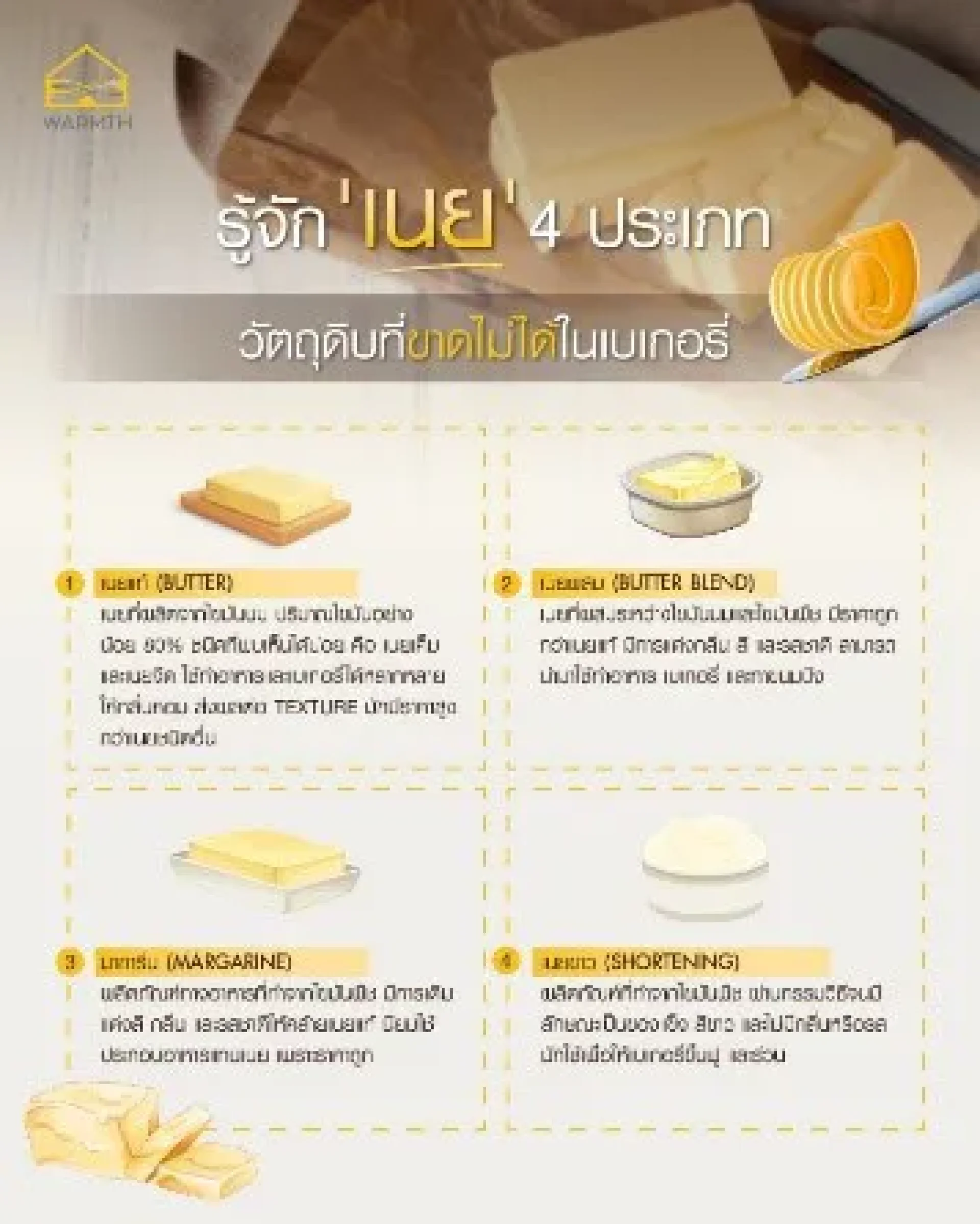 WARMTH พามาทำความรู้จักกับ เนย 4 ประเภท ที่พบเห็นได้ทั่วไปในการทำขนม ทั้งรสชาติและคุณสมบัติที่แตกต่างกัน และทำไม WARMTH ถึงลงทุนเลือกใช้เนยแท้พรีเมียมนำเข้าจากฝรั่งเศส ที่มีราคาสูง มาใช้ทำครัวซองต์รวมถึงเบเกอรี่ต่างๆ
